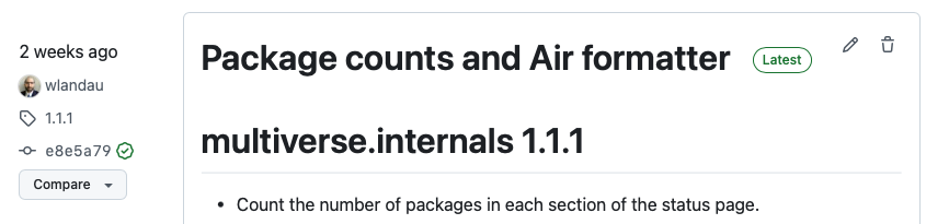To update your package to a new version on R-multiverse, simply create a new release on GitHub or GitLab. usethis::use_github_release()