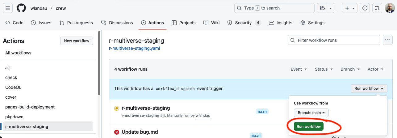 Then commit that file to GitHub, navigate to the “Actions” section of your repository, and run the r-multiverse-staging